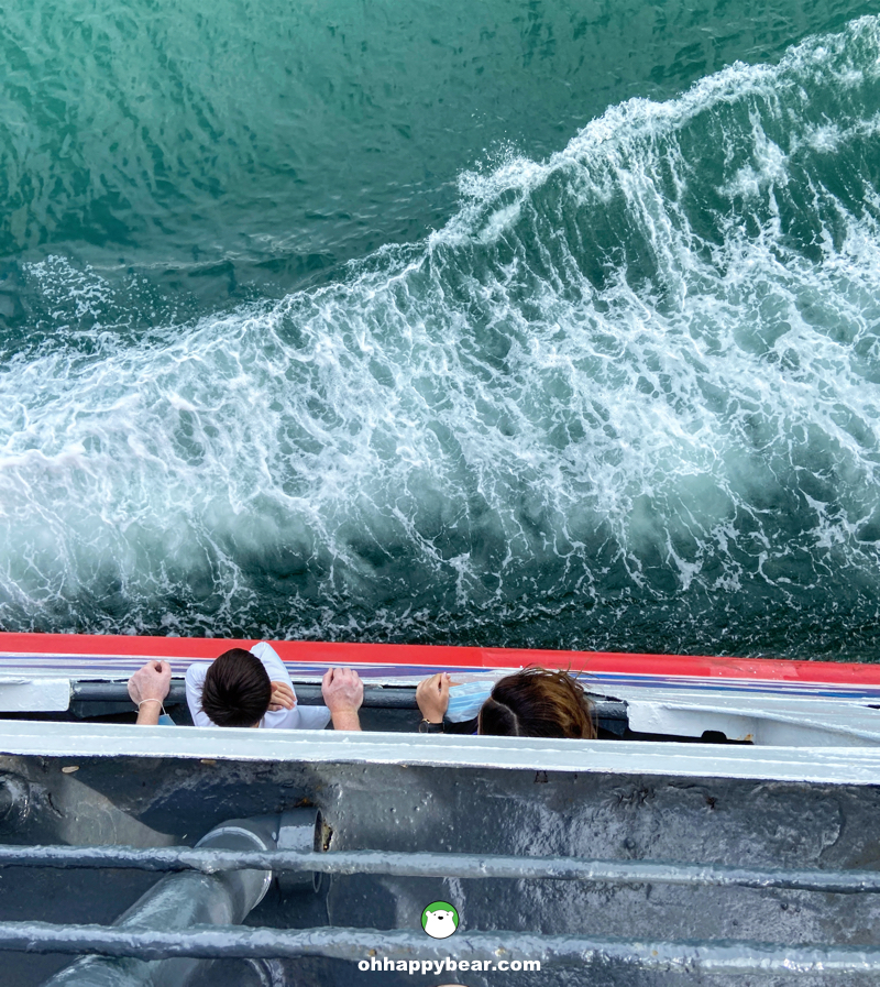 Our experience boarding and leaving the ferry was systematic and quick: one single line in and out from the ship and the first waiting vehicle made the entrance as soon as the last vehicle made its departure. The cars are all parked on the lower deck: passengers can wander around on the two upper platforms. There is an air-conditioned room on the second floor, but given the Covid 19 situation, of course, we opt to stay with the breeze on the third floor. The journey takes almost two hours. So, bring a novel. 😀