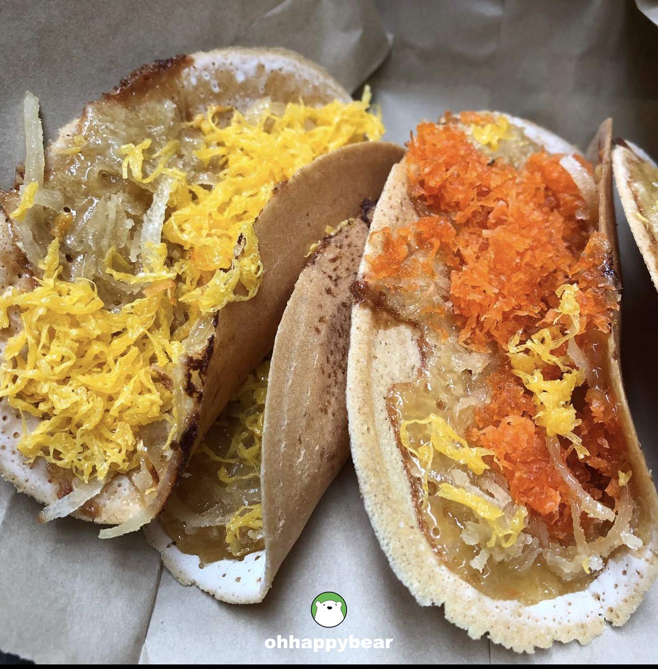 Above: Khanom Bueng (Thai crispy crepes) are usually available in “sweet” and “savoury” versions. The sweet is made from egg floss (Foi Thong), and the savoury is made from shrimp and coconut with pepper, cilantro, and kaffir lime leaves.
